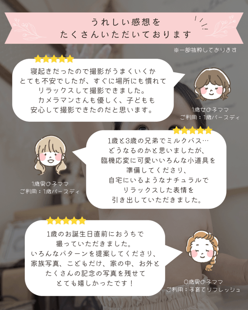 桑名市のフォトスタジオ「mamato photo」をご利用いただいた育休中のママたちから、温かいメッセージをいただいています。桑名市内で子育て中のママたちの実際のお声をご紹介させていただきます。