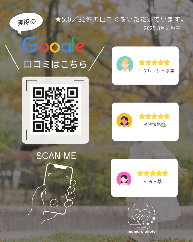 桑名市のおうちフォトスタジオ「mamato photo」は、おかげさまでGoogle口コミで★5.0/31件をいただいており、リピート率は8割となっています。※2025年8月現在