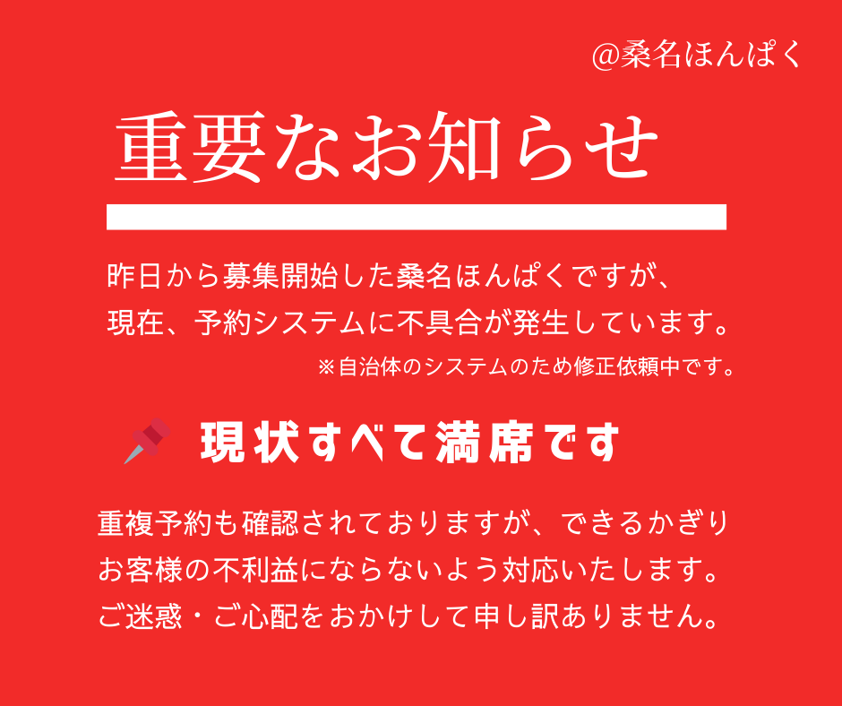 ただいま、桑名ほんぱくの予約システムに不具合が発生しております。