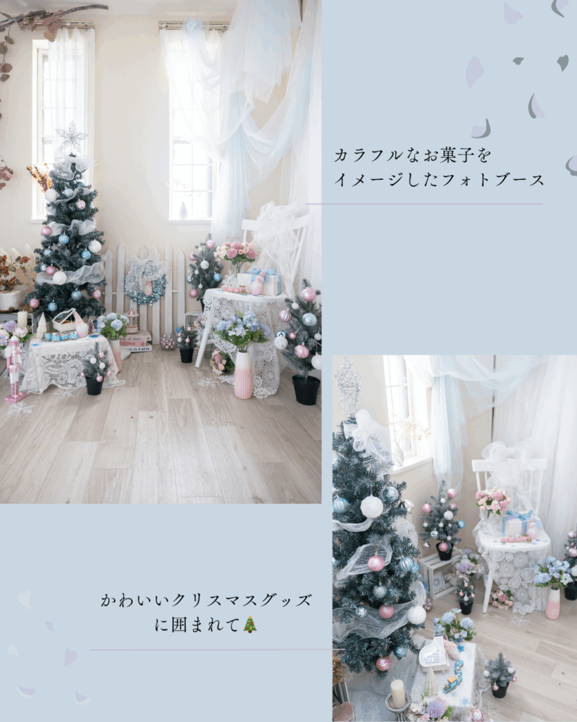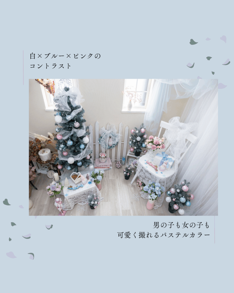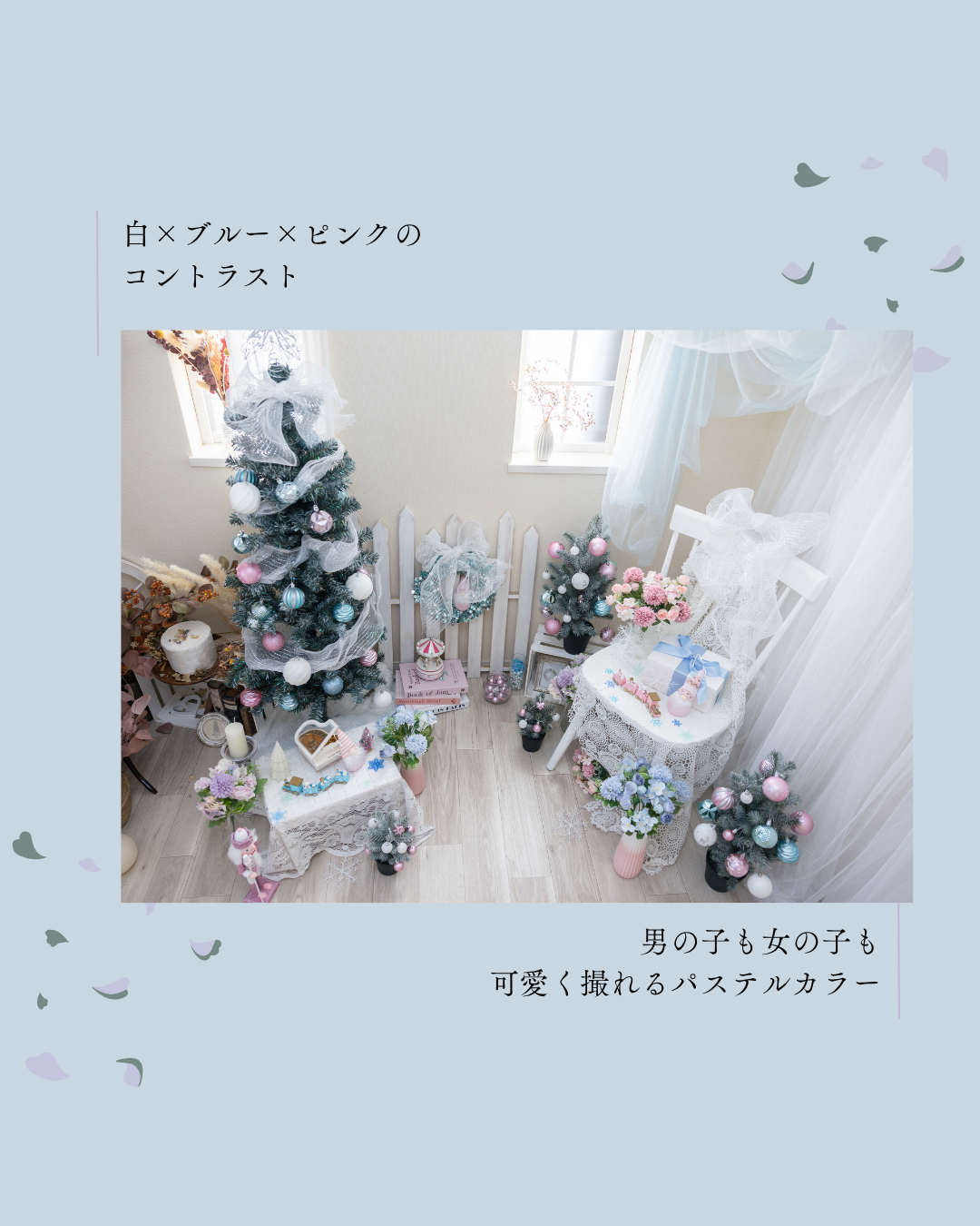 白・ブルー・ピンクを基調とした淡い色合いのフォトブースで、