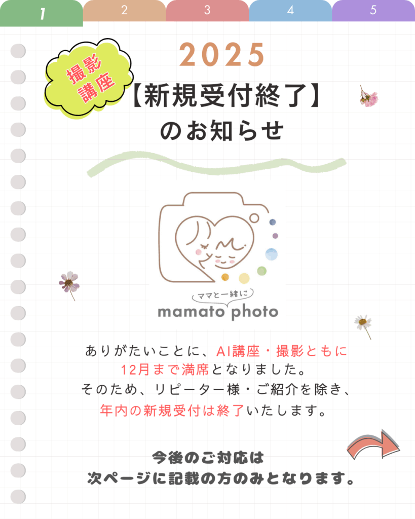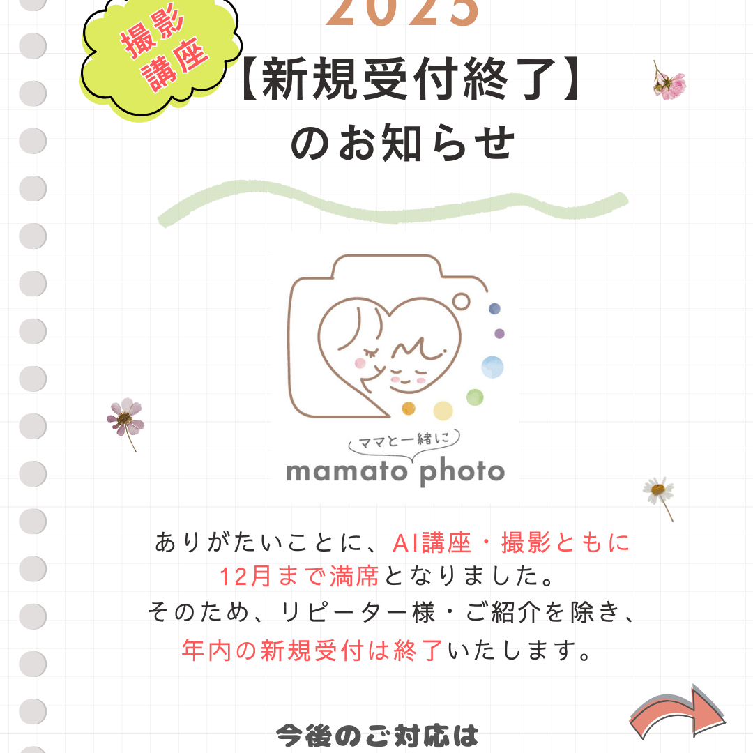 おかげさまで、AI講座・撮影ともに12月まで満席となったため、年内の新規受付を終了させていただきます。
